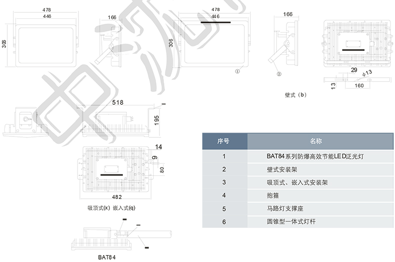 > 本灯具适用于座式、吸顶式、壁式等安装方式,还可做马路灯使用;