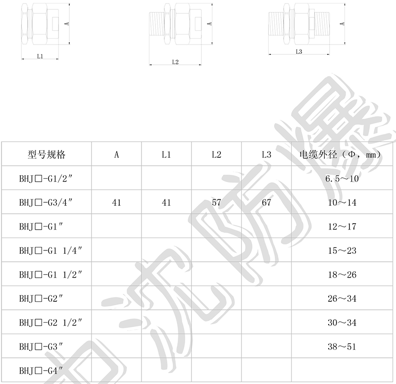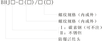 > 按照产品型号规格逐条选择并注明猫咪下载视频标志,例如:需要隔爆型碳素钢一内一外 G3/4″螺纹猫咪下载视频活接头,则产品选型为 BHJ- G3/4(内)/ G3/4(外) ExdⅡC